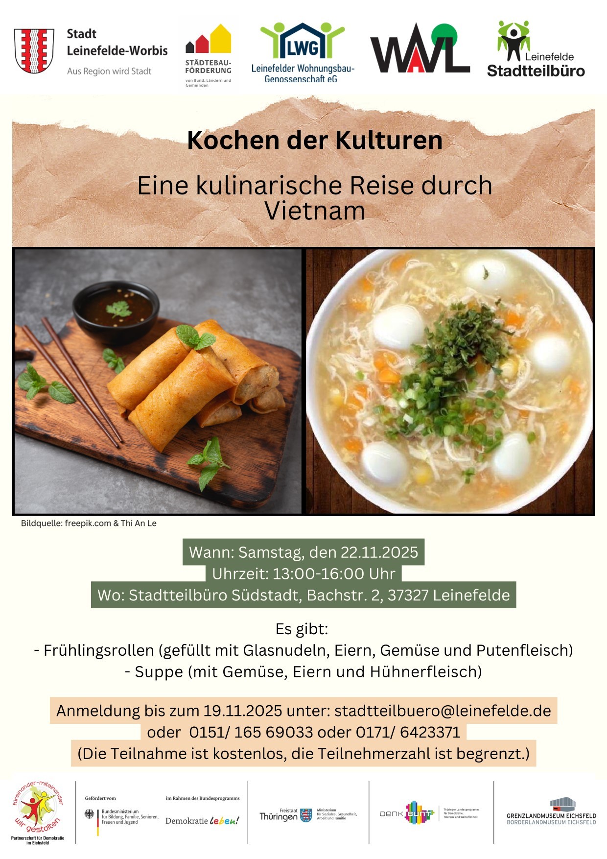 Nur zwei Wochen später, am Samstag, 22. November 2025, geht es weiter nach Vietnam. Auf den Tisch kommen frisch zubereitete Frühlingsrollen mit Glasnudeln, Eiern, Gemüse und Putenfleisch sowie eine aromatische Suppe mit Eiern, Gemüse und Hühnerfleisch. Anmeldeschluss ist hier der 19. November 2025.