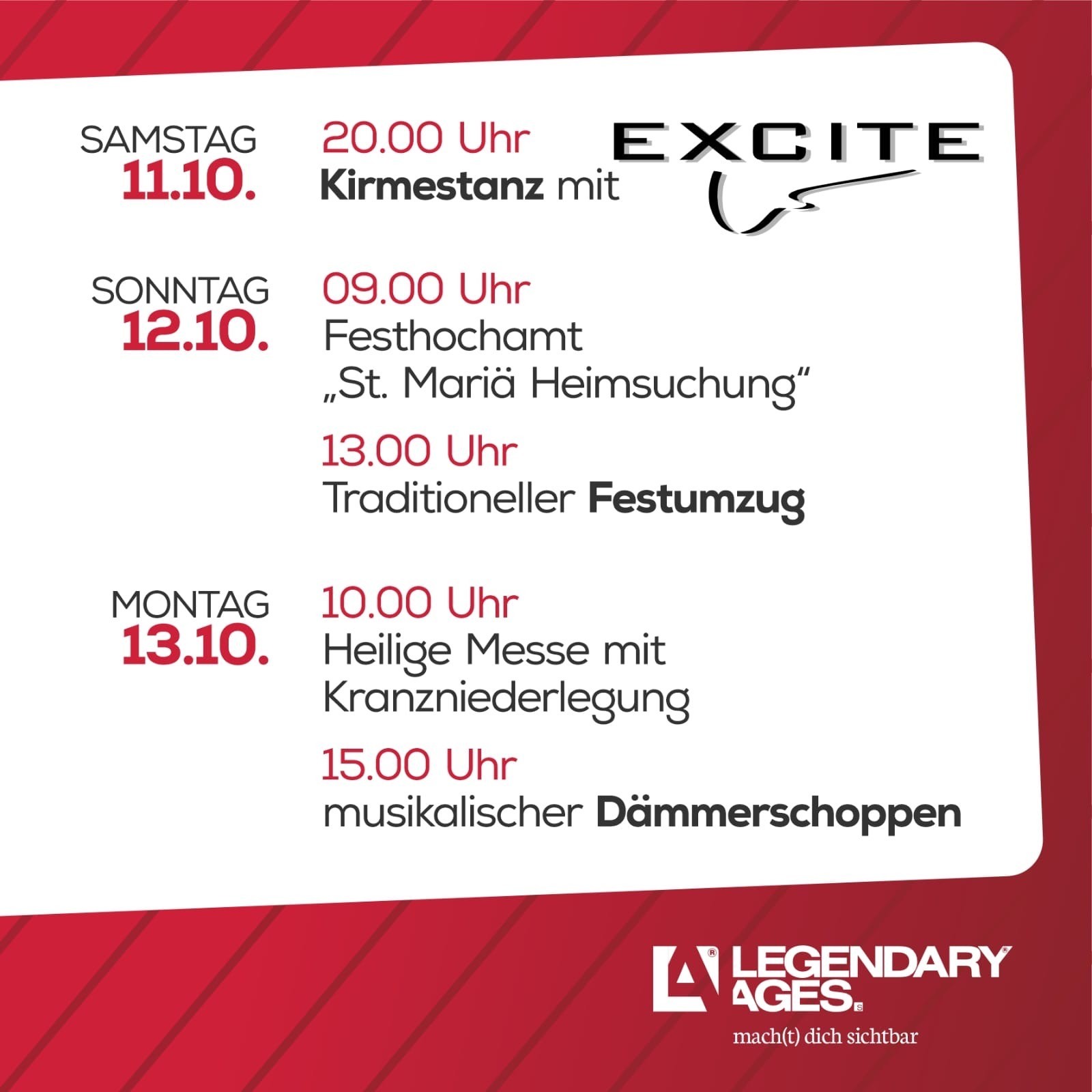 Den Auftakt bildet am Samstag, 11. Oktober, der Kirmestanz mit der Band Excite ab 20 Uhr. Am Sonntag, 12. Oktober, steht zunächst das Festhochamt in der Kirche „St. Mariä Heimsuchung“ auf dem Programm, bevor um 13 Uhr der traditionelle Festumzug durch den Ort startet.