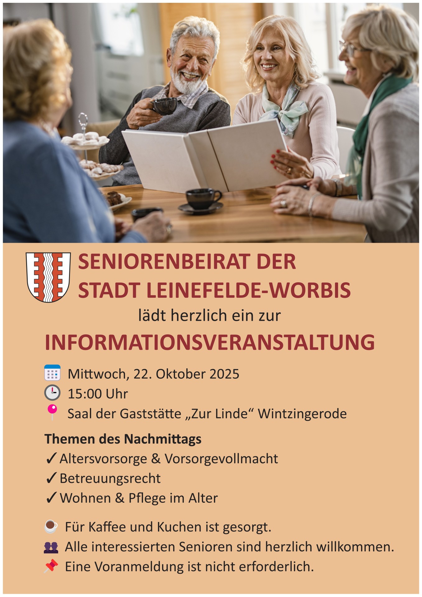 Neben den Fachinformationen soll auch das gesellige Beisammensein nicht zu kurz kommen: Für Kaffee und Kuchen ist gesorgt. Eine Voranmeldung ist nicht erforderlich. Der Seniorenbeirat freut sich auf zahlreiche Gäste und einen regen Austausch.