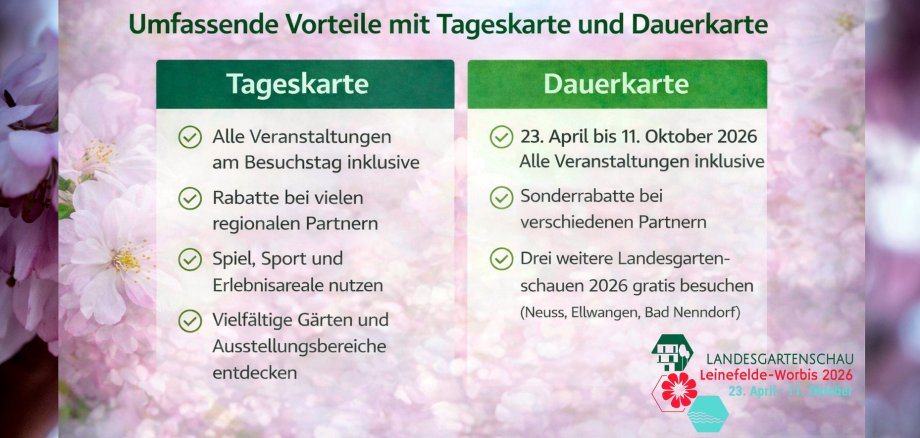 Nicht nur die Tageskarte lohnt sich. Auch die reguläre Dauerkarte bringt einen besonderen Mehrwert mit sich. Wer eine Dauerkarte für die Landesgartenschau Leinefelde-Worbis 2026 besitzt, kann damit jeweils einmal kostenlos auch die drei weiteren Landesgartenschauen in Neuss, Ellwangen und Bad Nenndorf besuchen. Eine Anmeldung ist dafür nicht erforderlich. Die Tageskarte für die jeweilige Schau wird direkt an den Kassen der anderen Standorte eingelöst. Die Regelung gilt für alle regulären Dauerkarten.