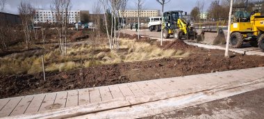 Auch symbolische Elemente nehmen Gestalt an. Beete nach den Patenstädten von Leinefelde-Worbis sind bereits angelegt. Der Kirchenpavillon ist in seinen Umrissen deutlich erkennbar. Dahinter entsteht mit dem „Tausendjährigen Kirrode“ eine historische Referenz an den Vorgängerort von Leinefelde.