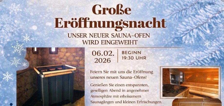 Am Freitag, 6. Februar 2026, wird der neue Sauna-Ofen offiziell in Betrieb genommen. Die große Eröffnungsnacht beginnt um 19.30 Uhr und lädt zu einem stimmungsvollen Saunaabend in angenehmer Atmosphäre ein.