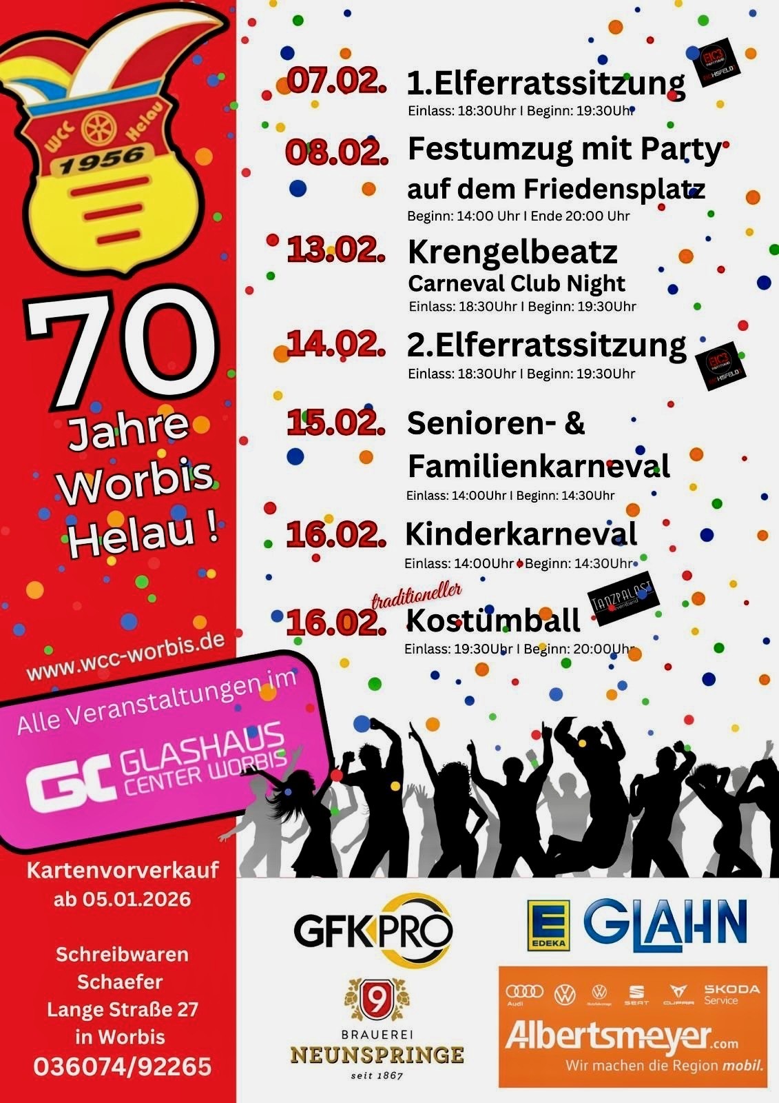 Den Auftakt bildet am 7. Februar die erste Elferratssitzung. Am 8. Februar folgt der Festumzug mit anschließender Party auf dem Friedensplatz. Mit der „Krengelbeatz – Carneval Club Night“ am 13. Februar und der zweiten Elferratssitzung am 14. Februar stehen weitere Höhepunkte auf dem Programm. Der 15. Februar gehört dem Senioren- und Familienkarneval, bevor am 16. Februar zunächst der Kinderkarneval und am Abend der traditionelle Kostümball den Abschluss bilden. Der Kartenvorverkauf startet am 5. Januar 2026.