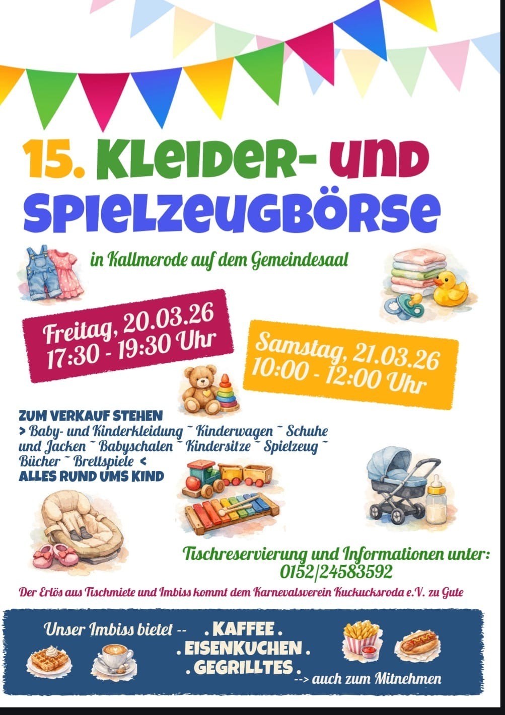 Zum Verkauf stehen Baby- und Kinderkleidung, Kinderwagen, Schuhe und Jacken, Babyschalen, Kindersitze, Spielzeug, Bücher und Brettspiele. Kurz gesagt: alles rund ums Kind. Damit bietet die Börse eine ideale Plattform, um gut erhaltene Artikel nachhaltig weiterzugeben und gleichzeitig den eigenen Geldbeutel zu schonen. Der Erlös aus Tischmiete und Imbiss kommt dem Karnevalsverein Kuckucksröda e. V. zugute. Auch für das leibliche Wohl ist gesorgt. Der Imbiss bietet Kaffee, Eisenkuchen und Gegrilltes an. Speisen können ebenfalls mitgenommen werden.