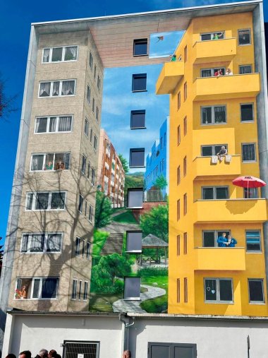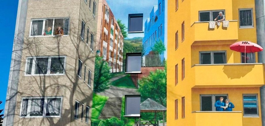 Die Gestaltung verbindet Architektur, Landschaft und Alltagsleben zu einer lebendigen Szenerie. Zwischen den Gebäuden öffnet sich eine Perspektive ins Grüne mit Wegen, Treppen und Aufenthaltsbereichen. Ergänzt wird das Motiv durch Szenen aus dem nachbarschaftlichen Leben auf Balkonen und in Fenstern. So entsteht ein künstlerischer Übergang von städtischer Wohnbebauung zur neu gestalteten Landschaft der Landesgartenschau.