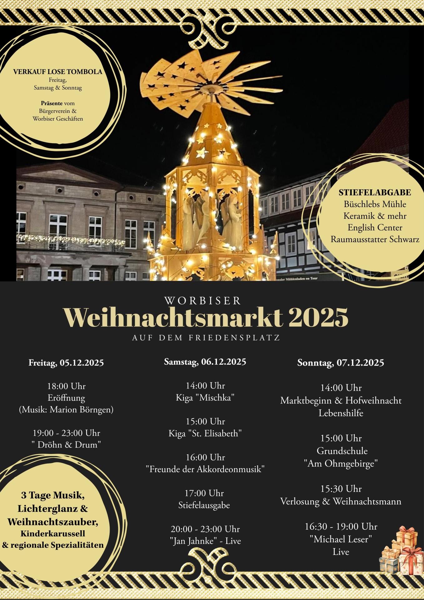 Gegen 17 Uhr schaut der Nikolaus persönlich vorbei, um die zuvor in den Worbiser Geschäften abgegebenen Stiefel gut gefüllt an die Kinder zu übergeben – ein Höhepunkt des Tages. Ab 20 Uhr geht es dann auf der Bühne mit handgemachter Live-Musik von Jan Jahnke an der Gitarre musikalisch weiter.